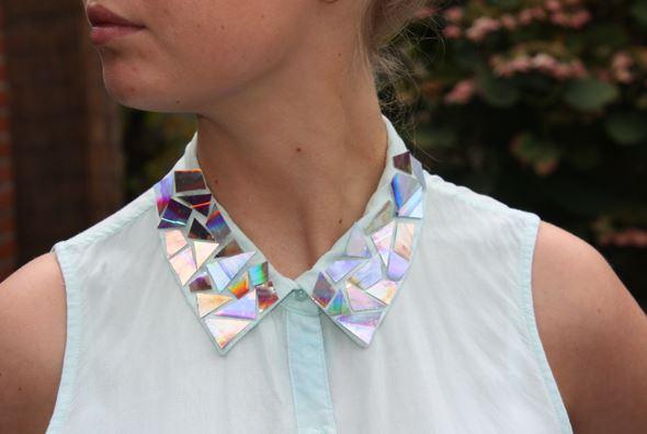 Whether you want to revamp an old shirt, or jazz up a clutch bag, using a cut up CD to add holographic detail to your old clothes and bags is a simple yet effective option! Choose the strongest glue you can find and ensure that you file down any sharp edges. Just like the example above from