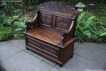 VICTORIAN CARVED OAK MONKS BENCH BOX SETTLE PEW CHEST